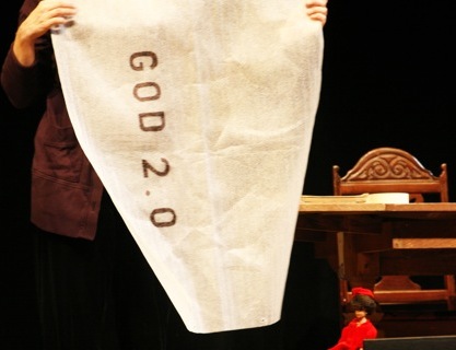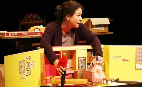Sets – table, chair, trunk, cardboard boxes, packing materials, Barbie items, items with titles added to a variety of objects revealed during the course of the play, photographs.